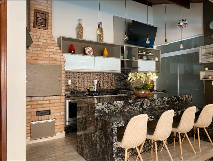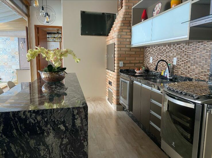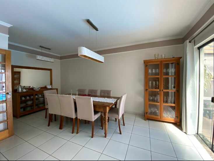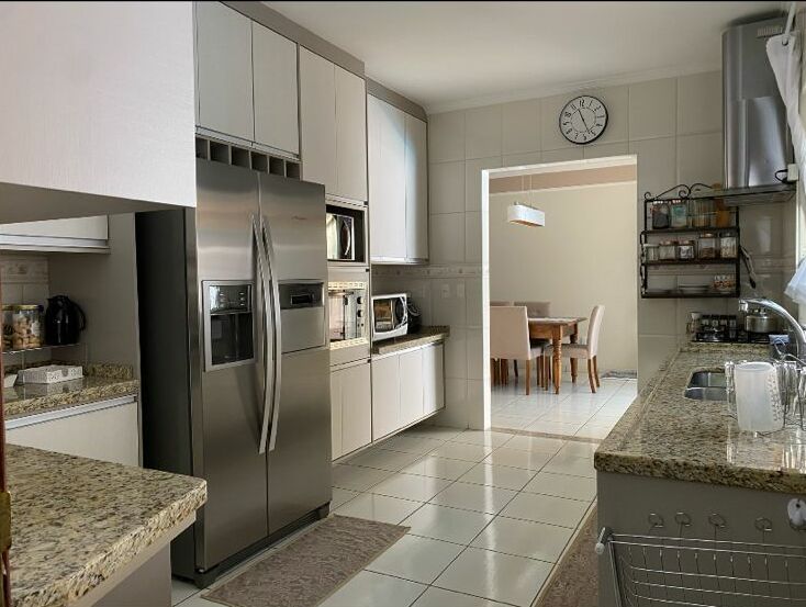 6 banhiros,3 salas, lavabo, cozinha planejada , despensa lavanderia ,área Gourmet ,banheiro quarto ,pia ,churrasqueira ,piscina, garagem para 4 carros sendo 2 cobertas portão eletrônico, jardim.